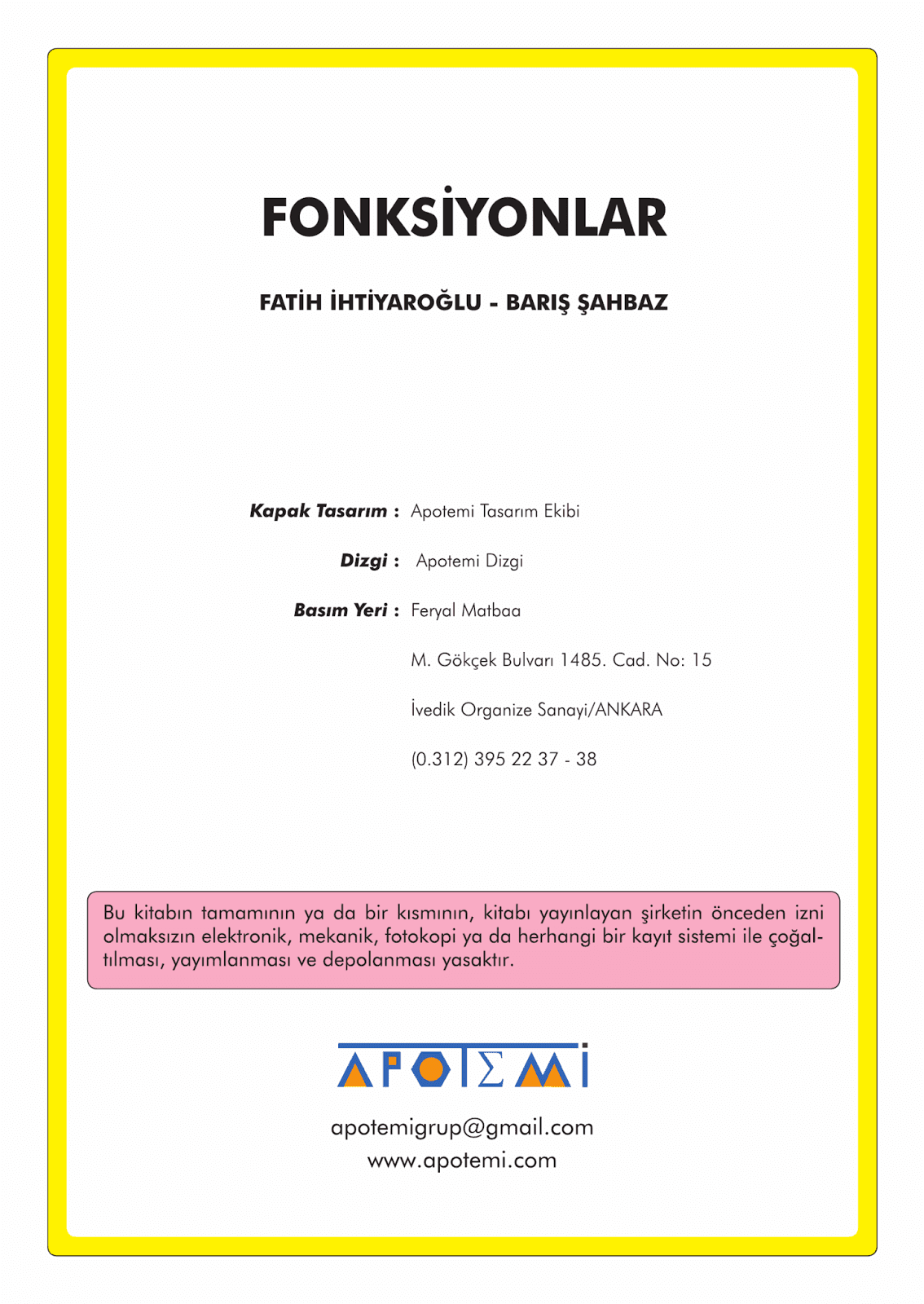 2017 Apotemi Fonksiyonlar Fasikülü PDF indir sitemizde bulunan tüm PDF dosyaları yeni müfredat'a tam uyumlu tamamı renkli ve kaliteli yeni basım kitaplardır. Yapmanız gereken aşağıdaki linkten PDF dosyasını normal indirme olarak indirmektir.